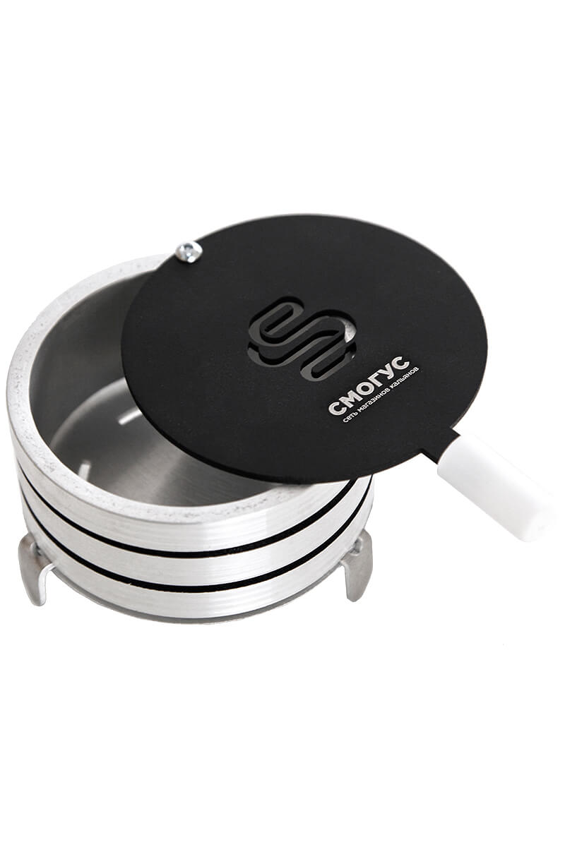 Корпус калауда Смогус изготовлен из алюминия, что повышает его теплопроводность и обеспечивает оптимальный прогрев. Ручка отделана фторопластом, который не пропускает жар и не дает обжечься при вращении крышки. Через дырочки в фольге пепел может попасть в табак и придать дыму неприятный привкус; при использовании калауда такое исключено, поэтому курение кальяна с ним становится максимально комфортным.