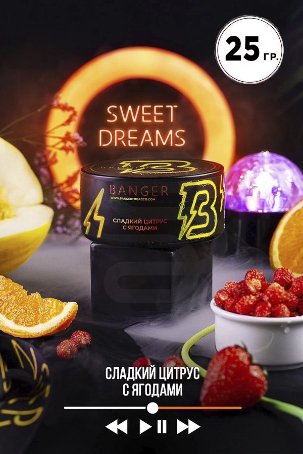 Banger Sweet dreams (Сладкий цитрус с ягодами) – интересный микс спелого апельсина и домашних ягод: клубники и земляники. Сочная кислинка цитруса слилась с насыщенной ягодной сладость, чтобы подарить вам настоящее блаженство от каждой минуты покура.