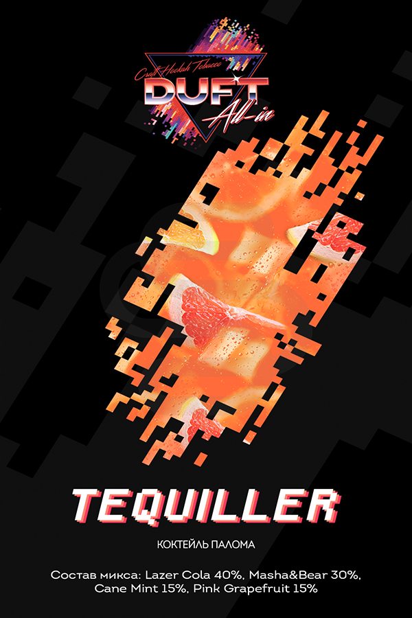 Duft All In Tequiller (Алкогольный коктейль) – пьянящий вкус коктейля Палома. Здесь вы найдете текилу, слегка горьковатый сок грейпфрута, освежающую мяту, землянику и даже капельку колы. Сбалансированный вкус, который можно смело забивать соло и наслаждать крутым отдыхом с дымным кальянчиком.