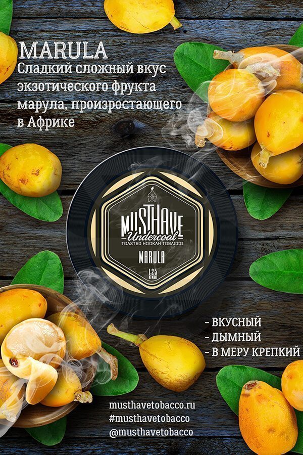 Must Have Marula (Марула) – очень сладкий, почти приторный и сложносочиненный вкус африканского фрукта. Must Have Marula одновременно напоминает смесь манго, сливы, апельсина с карамелью, но есть в нем и терпкая кислинка, и ореховая нота, и сливочный оттенок. Аромат непривычный, экзотический, но сочный и приятный. Ощущения на выдохе можно сравнить с нежным послевкусием от ликера Baileys. Marula будет хорошо сочетаться с «алкогольными», ледяными, мятными и освежающими табачными муасселями. Приторность аромата сглаживается в букете с кислыми цитрусами и яблоками, лесными ягодами и кокосом.