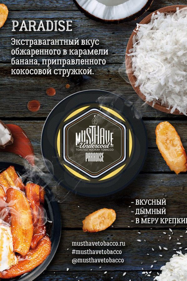 Must Have Paradise (Банан, кокос, карамель) – один из самых необычных, около десертных вкусов, представленных в линейке. Спелый банан обжарен в сладкой карамели, которая дает на выдохе легкие сливочные нотки, и посыпан ароматной кокосовой стружкой. Вкус интересно раскрывается при забивке соло.
