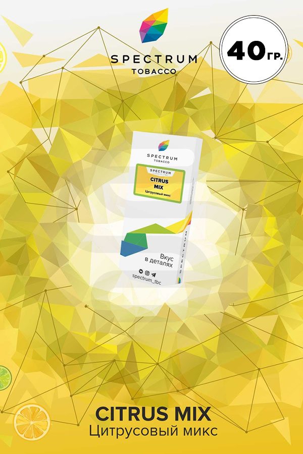 Spectrum Citrus mix (Цитрусовый микс) — солнечный апельсин, освежающий лайм, кислый лимон и терпкий грейпфрут. Целый букет цитрус объединились вместе, чтобы подарить вам насыщенный, кисло-сладкий вкус и потрясающий аромат. Цитрусы круто миксуются с ягодными и коктейльными табаками.