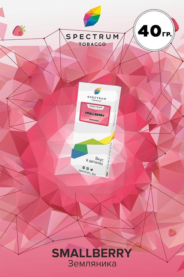 Spectrum Smallberry (Земляника) — нежный, сладкий вкус лесной земляники. Натуральный аромат и насыщенный вкус никого не оставят равнодушным. Земляника подходит как для курения соло, так и для создания фруктовых и ягодным миксов. Интересно раскрывается в сочетании с десертными табаками.